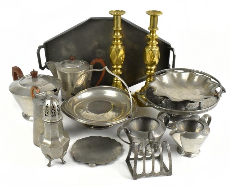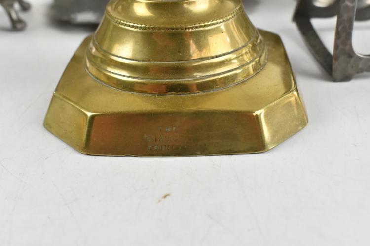 Lot 1319 of 2921: A quantity of metalware to include hammered pewter also a large pair of diamond princess brass candlesticks.