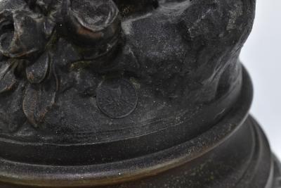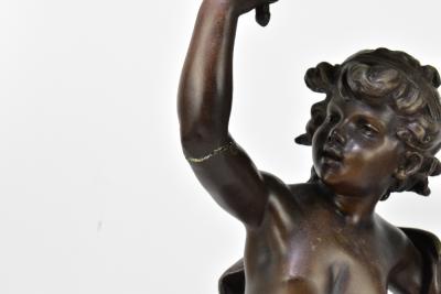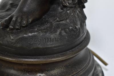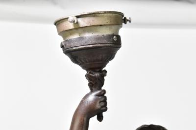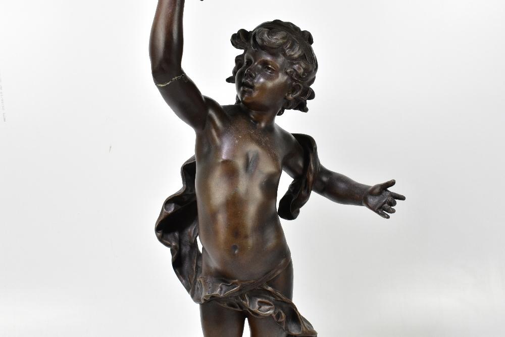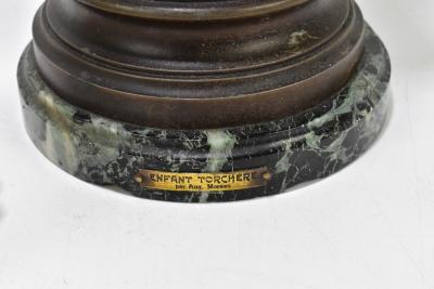 Lot 1335 of 2921: AFTER MOREAU; a bronzed spelter figural table lamps modelled as a putto holding a torch, with foundry mark and green marble base, and three associated glass flame shades, height of the figure 78cm including torch.