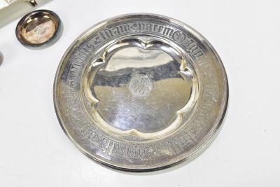Lot 1337 of 2921: An early 20th century silver plated desk stand with detachable glass inkwells, together with a three piece travelling communion set and a silver plated offering plate inscribed 'Presented in the trustees of Mount Arthur Chapel, Stockport, by Mrs Hallam, Sep 1868'.