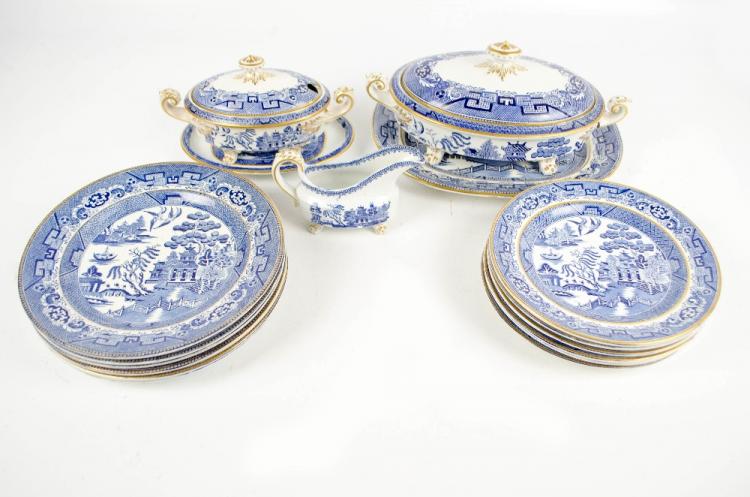 Lot 1180 of 2688: A small quantity of blue and willow pattern dinner ware including an oval twin handled tureen and cover, small oval meat plate, a small tureen and cover, various plates and a sauce boat with stand.