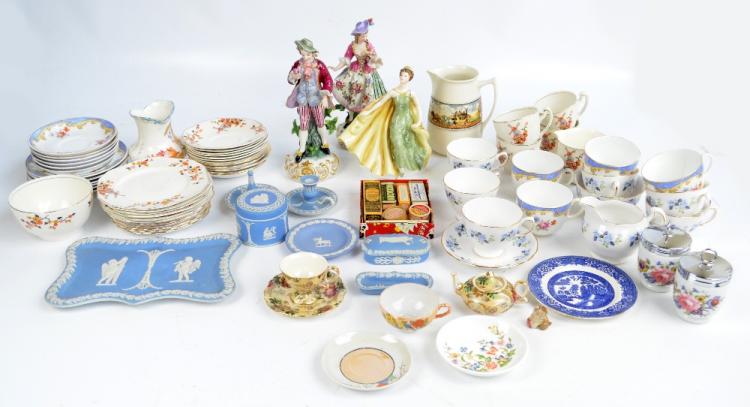 Lot 1206 of 2688: A mixed quantity of ceramics including HN2398 Royal Doulton 'Alexandra', a Wedgwood jasperware dressing table set, two Continental figures, a part Royal Vale tea service, a box of vintage pharmaceutical packaging, etc.