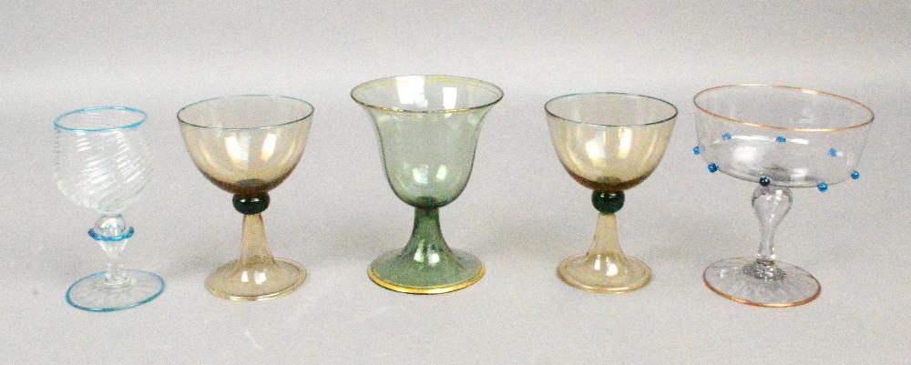 Lot 1271 of 2688: A pair of early 20th century Continental liqueur glasses with pale brown tinted bowls with green rims above green bobbin stem and invert trumpet folded foot, height 9.5cm, a late 19th century Venetian champagne glass with shallow bowl set with applied blue glass prunts, hollow wrythen moulded baluster stem and moulded foot, height 10cm, a green tinted Continental glass with bell shaped bowl and invert trumpet base, both heightened in gilt, height 10cm and an early 20th century small Venetian gla