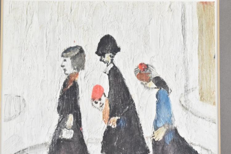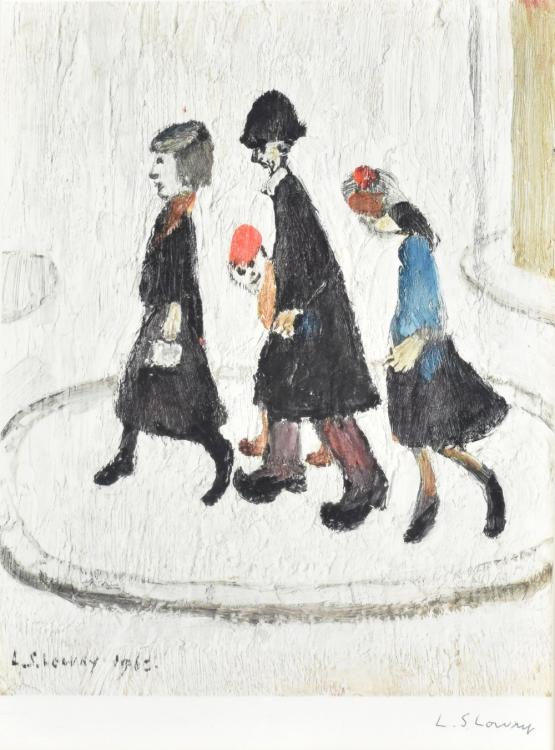 Lot 7 of 552: LAURENCE STEPHEN LOWRY RBA RA (1887-1976); colour print, 'My Family', signed in black ink lower right and with Fine Art Trade Guild blind stamp lower left, initialled 'HJA', 29 x 22cm, framed and glazed. (D)