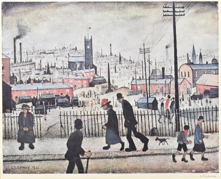 Lot 11 of 552: LAURENCE STEPHEN LOWRY RBA RA (1887-1976); a signed limited edition colour print, 'View of A Town', signed lower right, bearing blind stamp and letter to number code 163 lower left, 43 x 54.5cm, framed and glazed. (D)