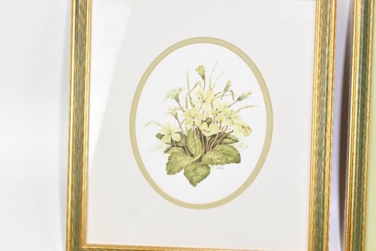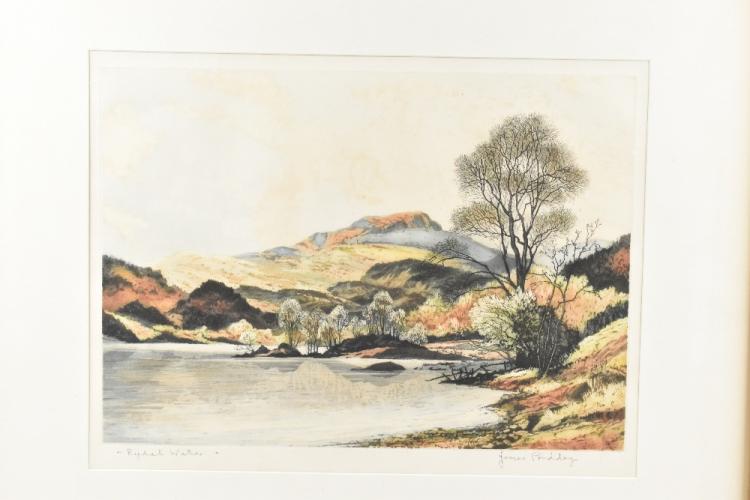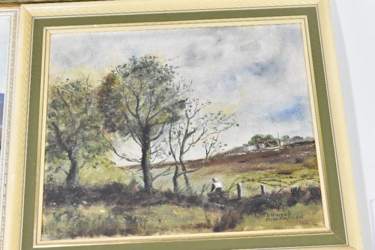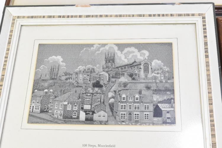 Lot 17 of 552: AFTER LAURENCE STEPHEN LOWRY RBA RA (1887-1976); colour print, Houses in Broughton, 31cm x 41.5cm, a Harold Riley signed print of Prestbury Church, a James Priddy print of Rydal Water, pencil and watercolour, brook in a field, 18 x 26cm, with a Margaret Brocklehurst oil on canvas country scene, a P.N. Craven oil on board, highlands scene, dated ’79, a small watercolour, a pair of botanical watercolours, a watercolour signed Frazer, and two Macclesfield silks, etc (11)