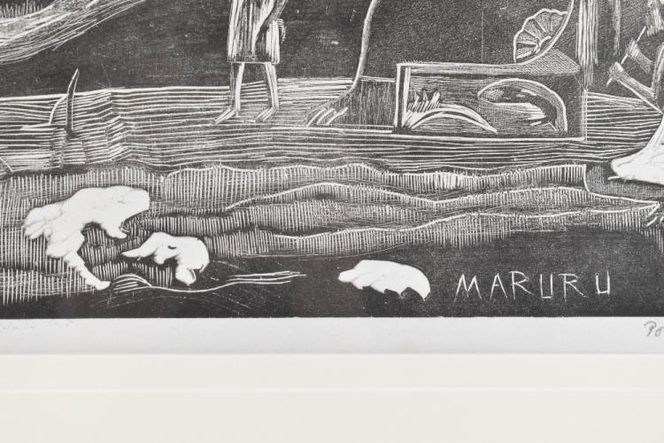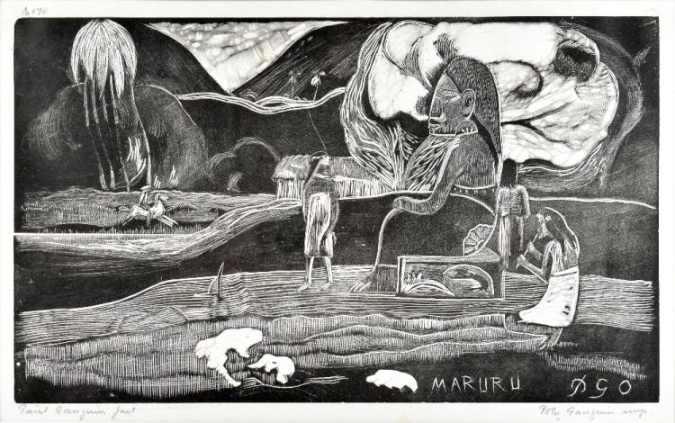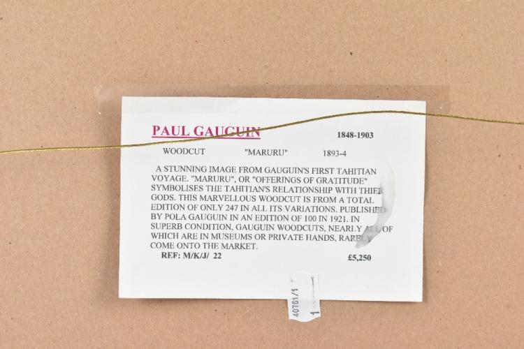 Lot 20 of 552: PAUL GAUGUIN (FRENCH, 1848-1903); woodcut on paper, 'Maruru', numbered 70 of an edition of 100 to the top left corner, published by the artist's son Pola Gauguin in 1921, signed 'Pola Gauguin IMP' and inscribed 'Paul Gauguin fecit' in pencil, 21.5 x 30cm, framed and glazed, with gallery label verso. Provenance; purchased at Clyffe Hastings by the vendor's late father in 2002.