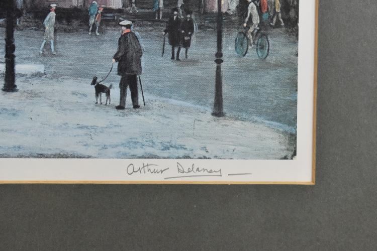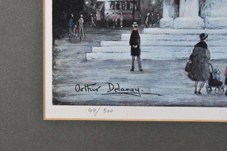 Lot 21 of 552: ARTHUR DELANEY (BRITISH, 1927-1987); limited edition colour print, 'Market Street and Piccadilly, Manchester', signed in pencil and numbered 99/500, published by Grove Galleries Ltd, Manchester, 33.5 x 34cm, framed and glazed. (D)