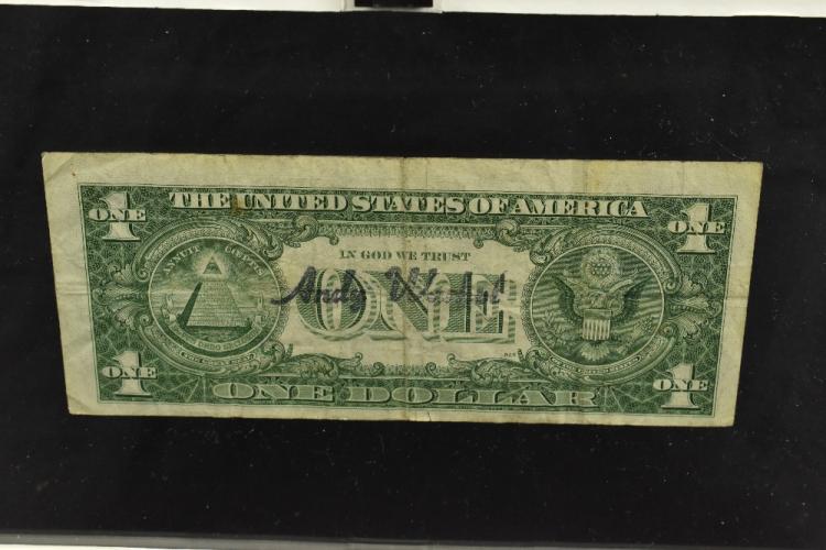 Lot 44 of 552: ANDY WARHOL (1928-1987); a $1 bill signed by Warhol, 6.5 x 15.5cm, with certificate of authenticity, framed and glazed. From a private Cheshire collector.