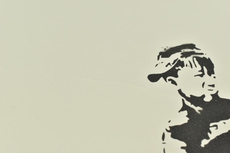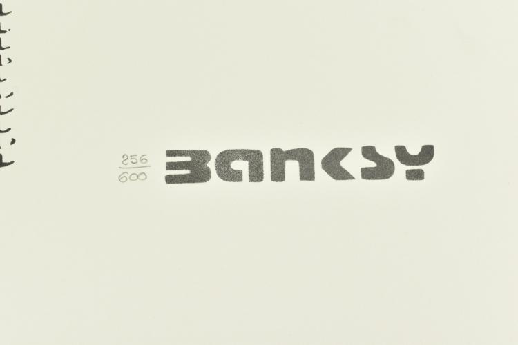 Lot 49 of 552: BANKSY; lithograph on card, 'The Crayola Shooter' (2012)', 256/600, artist stamp lower right, published by Kunsthaus Tacheles, label verso, sheet size 51 x 72cm, unframed. "Very rare print, It was, however, printed with his consent to raise money for the gallery in Berlin, after he had stencilled his famous Flower Thrower on the side wall. This is the only print ever created with the image by Banksy." From a private Cheshire collector.