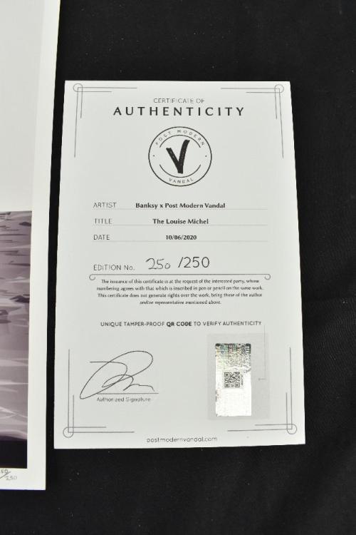 Lot 53 of 552: BANKSY; giclée print on museum quality Hahnem Uhle Fine Art paper, 'Post Modern Vandal/Louise Michel (2020)', 250/250, complete with certificate of authenticity, 33 x 48.5cm. (D) From a private Cheshire collector.