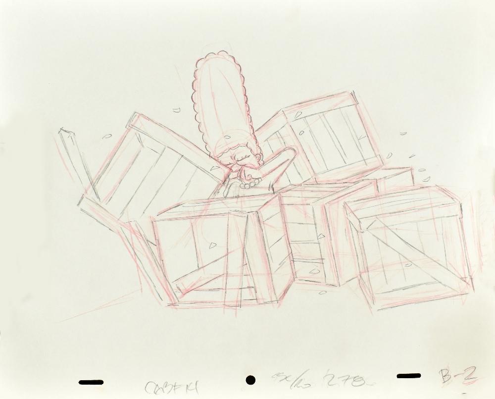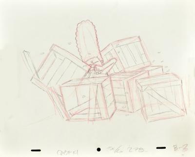 Lot 157 of 552: MATT GROENING (American, born 1954); in-house production drawing, 'Marge Simpson and Toppled Boxes', 26.5 x 31.5cm, unframed.  NB: Used in the design drawing from series 12 episode 18 'Trilogy of Error'.  From a private Cheshire collector.