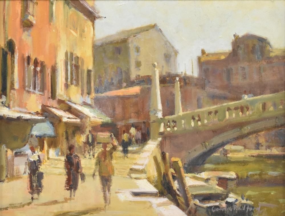 Lot 247 of 552: GORDON RADFORD (1936-2015); oil on board, 'Fondamenta Di Cannaregio, Venice', signed lower right, bears Tib Lane Gallery label verso, inscribed 'Exh. Dec. 1990', 18 x 23.5cm, framed. (D)
