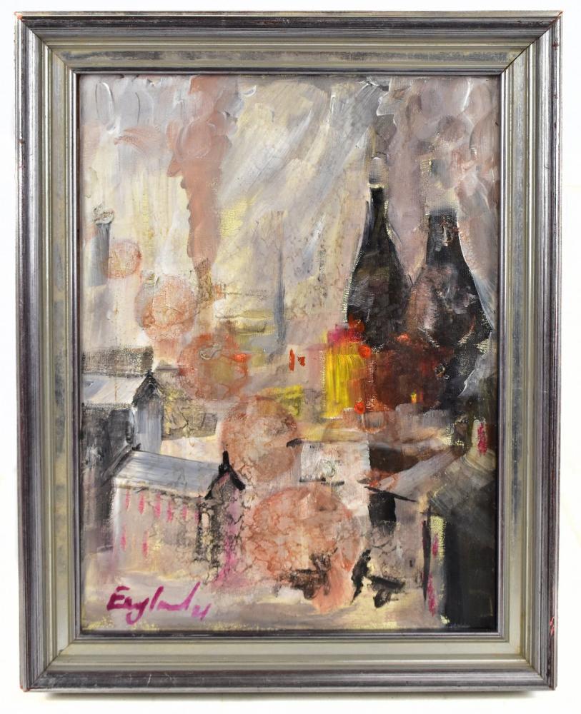 Lot 259 of 552: FREDERICK JOHN ENGLAND (born 1939); acrylic on canvas, 'Twin Kilns', signed and dated 21, 39.5 x 30cm, framed.