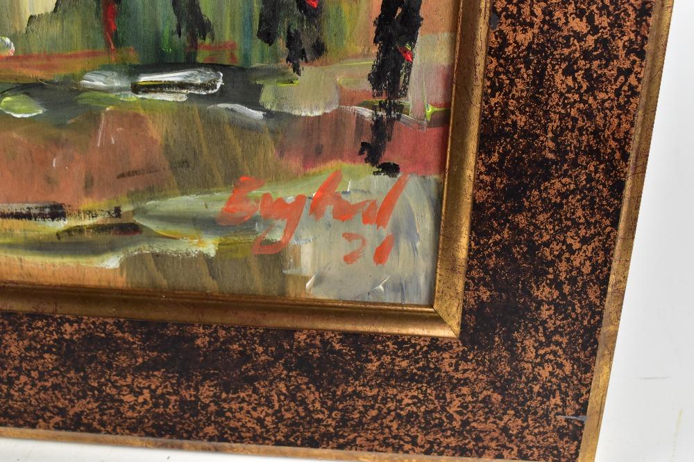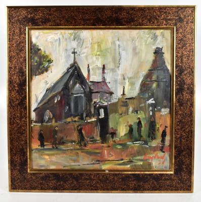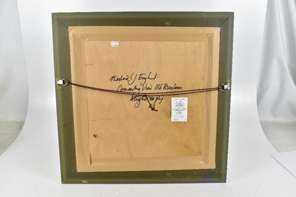 Lot 260 of 552: FREDERICK JOHN ENGLAND (born 1939); acrylic on board, 'Cemetery View, Old Burslem', signed and dated 21, 45 x 45cm, framed. This was exhibited at Spode Museum.