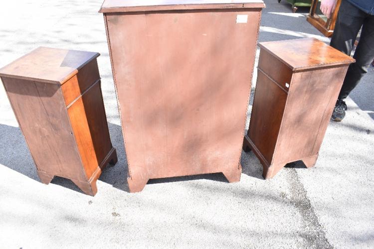Lot 506 of 552: A reproduction walnut bookcase, with two drawers and bracket feet, height 101cm, width 64cm, and a pair of reproduction walnut bedside cupboards (3).
