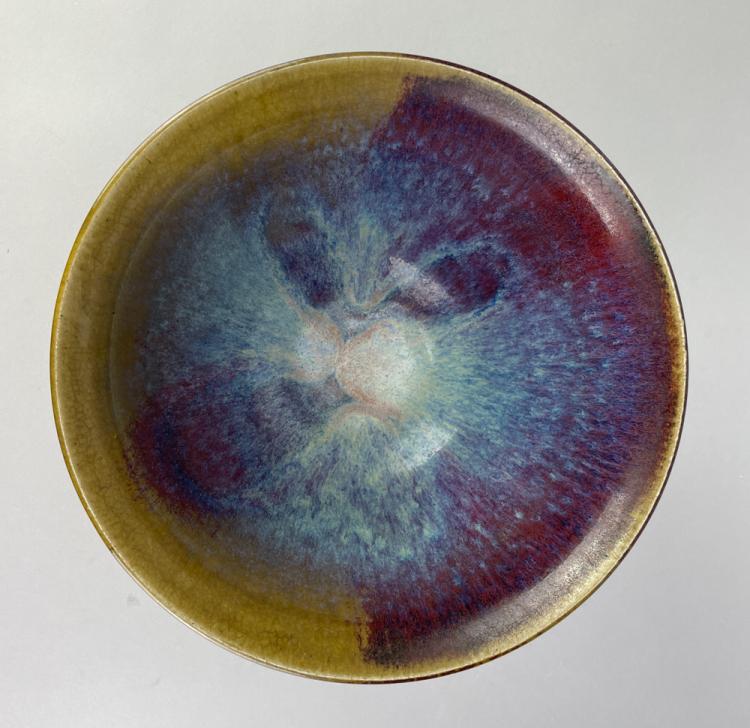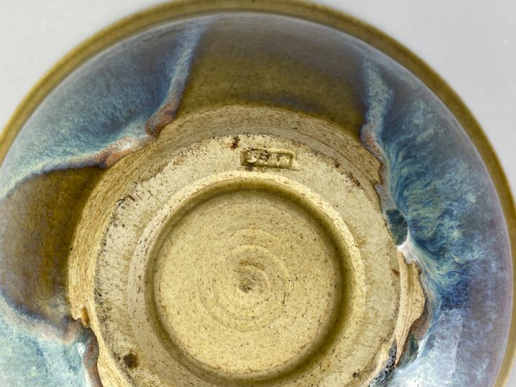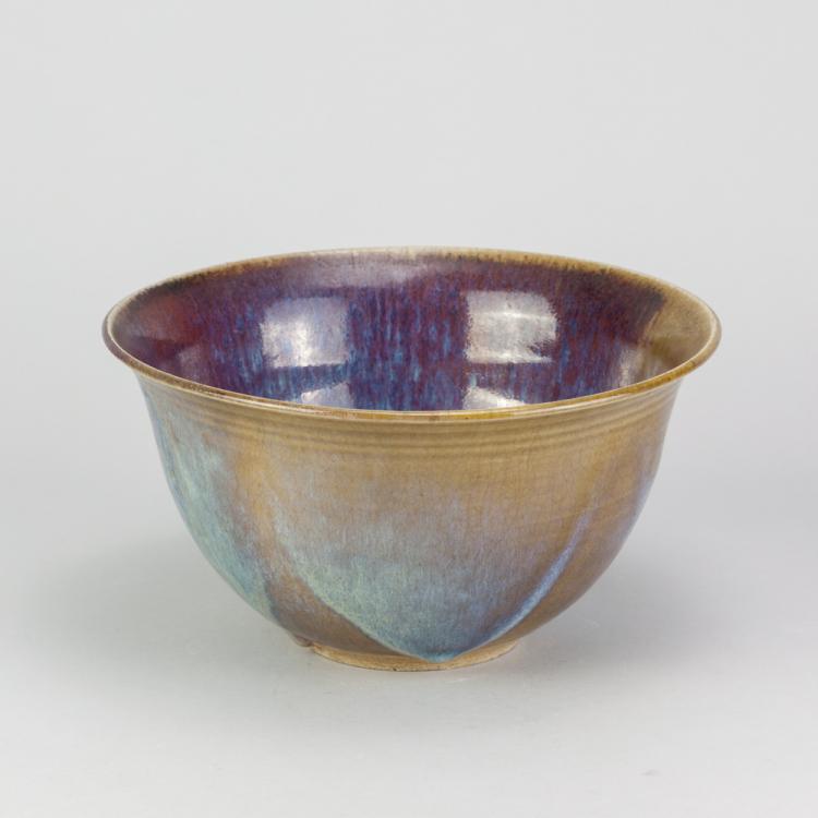 Lot 3 of 681: ABDO NAGI (1941-2001); a stoneware bowl covered in streaky blue and red glaze on green ground, impressed mark, diameter 24cm. (D)