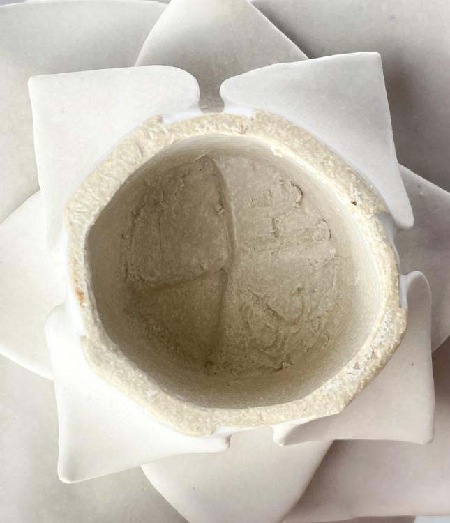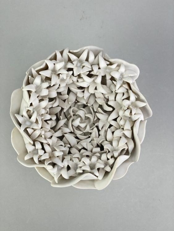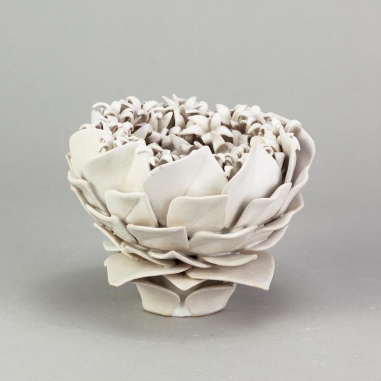 Lot 7 of 681: ADELE HOWITT; 'Seed Bud', a buff stoneware sculpture covered in white tin barium glaze, incised A mark, height 10.5cm, diameter 14cm.