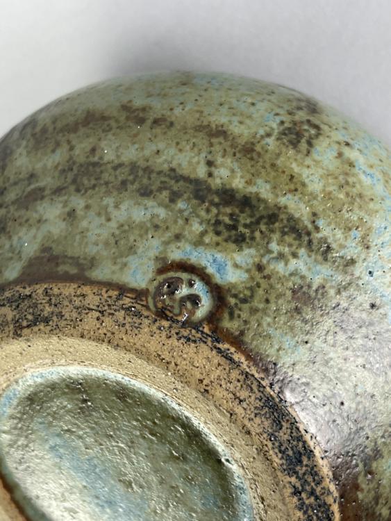 Lot 11 of 681: AGNETE HOY (1914-2000) for Bullers Studio; a porcelain bowl covered in oatmeal glaze with iron decoration, impressed AH, pottery marks and body number, diameter 18cm, a small Andrew Hague jug and a globular pot, possibly an early work by Stephen Parry (3). (D)