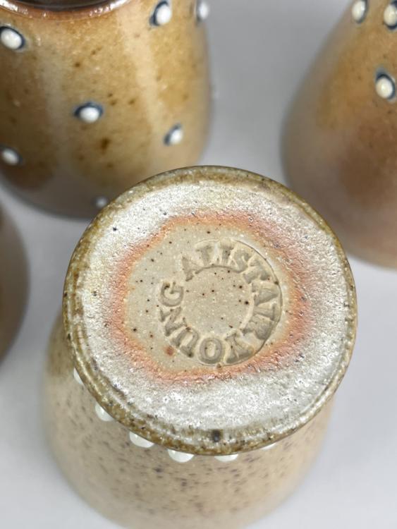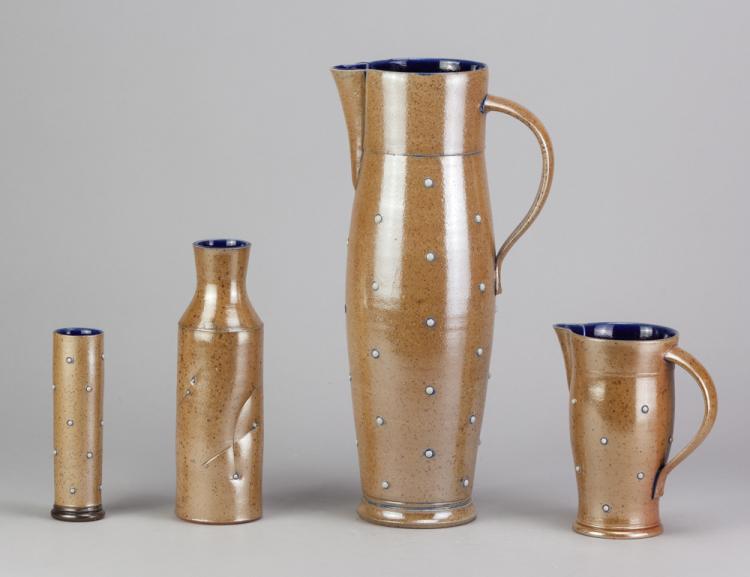 Lot 25 of 681: ALISTAIR YOUNG; a group of salt glazed ceramics with added porcelain decoration and dark blue interiors, comprising a tall jug, smaller jug, bottle, cylindrical vase, oval twin handled dish and six small beakers, tall jug height 31cm, dish diameter 32cm (including handles) (11). (D)
