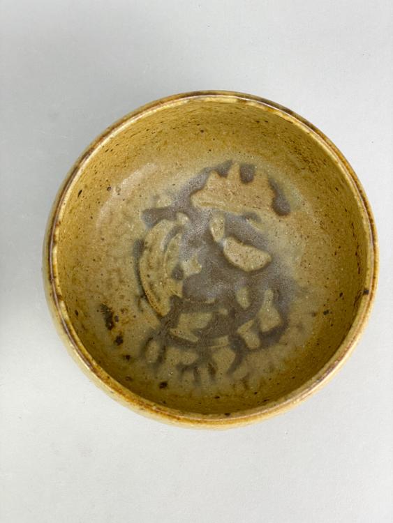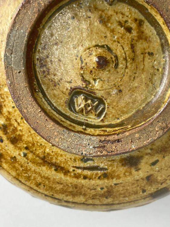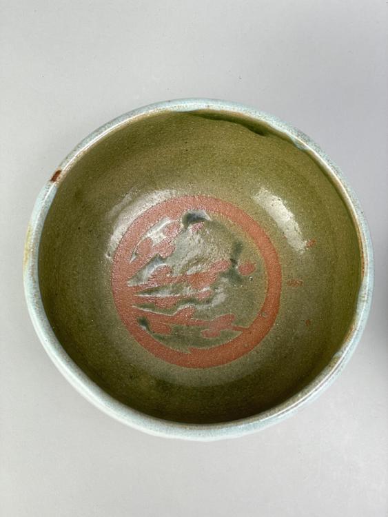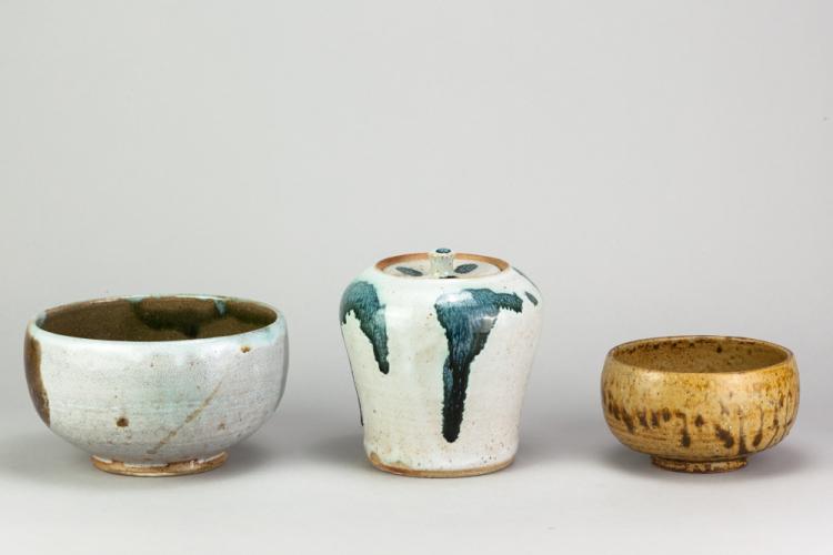 Lot 27 of 681: ANDREW MARSHALL (born 1952); a stoneware jar and cover covered in pale grey glaze with copper pours, impressed AM mark, height 15cm, a similar bowl with copper and iron decoration, diameter 17cm, and a smaller bowl covered in green ash and iron glaze, diameter 13.5cm (3). (D) Forms commonly made by William Marshall but emulated by his son Andrew after his father's death.