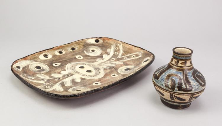 Lot 52 of 681: BERNARD FORRESTER (1908-1990); a slipware rectangular dish, painted F mark, 29.5 x 23cm, and a small stoneware bottle, height 10.5cm (2). (D)