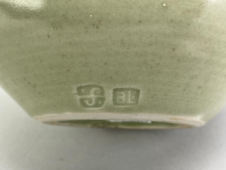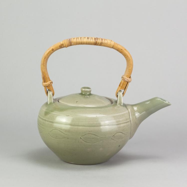 Lot 55 of 681: BERNARD LEACH (1887-1979) for Leach Pottery; a stoneware teapot with cane handle covered in celadon glaze with incised decoration, impressed BL and pottery marks, height 11.5cm (excluding handle). (D)