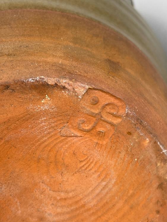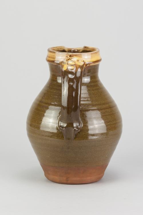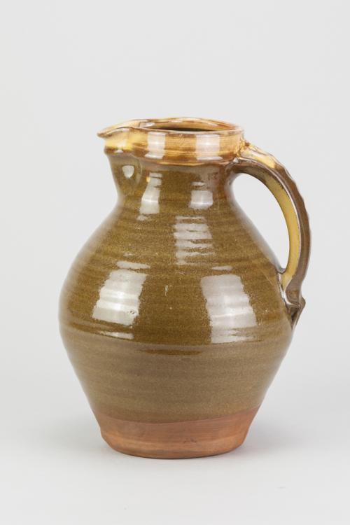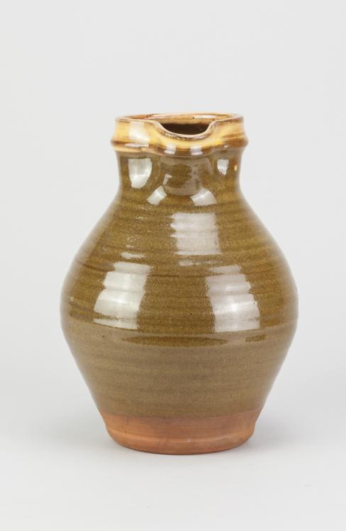 Lot 57 of 681: Attributed to BERNARD LEACH (1887-1979) for Leach Pottery; a large slipware jug with yellow slip to rim and handle and green to body, impressed pottery mark, height 25cm. (D) Provenance: Nancy & Andrew Ramage collection.