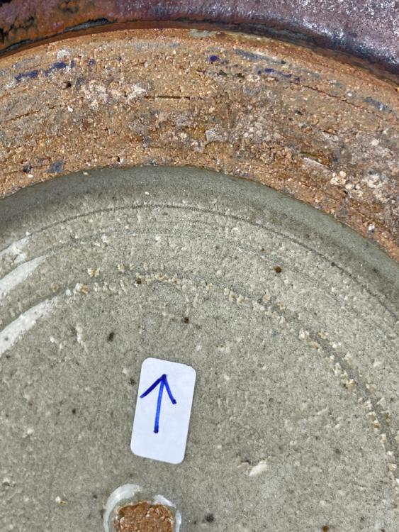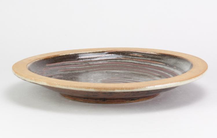 Lot 61 of 681: Leach Pottery; a stoneware shallow dish partially covered in tenmoku breaking to kaki glaze with wax resist decoration, impressed pottery mark, diameter 30cm.