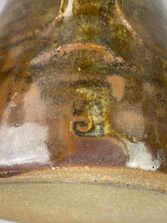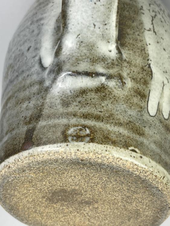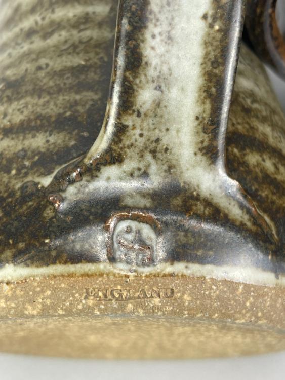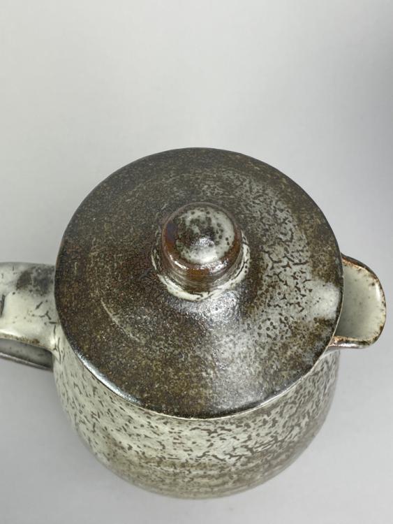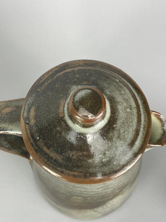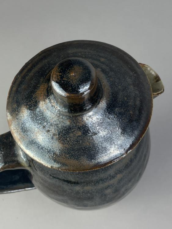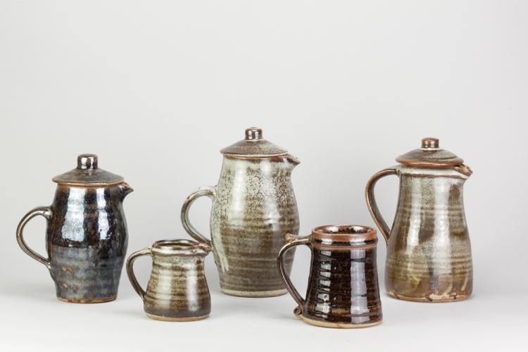Lot 64 of 681: Leach Pottery; three stoneware coffee pots, a mug and a small jug covered in mottled grey and/or tenmoku breaking to kaki glaze, impressed pottery marks, tallest 23.5cm (5).