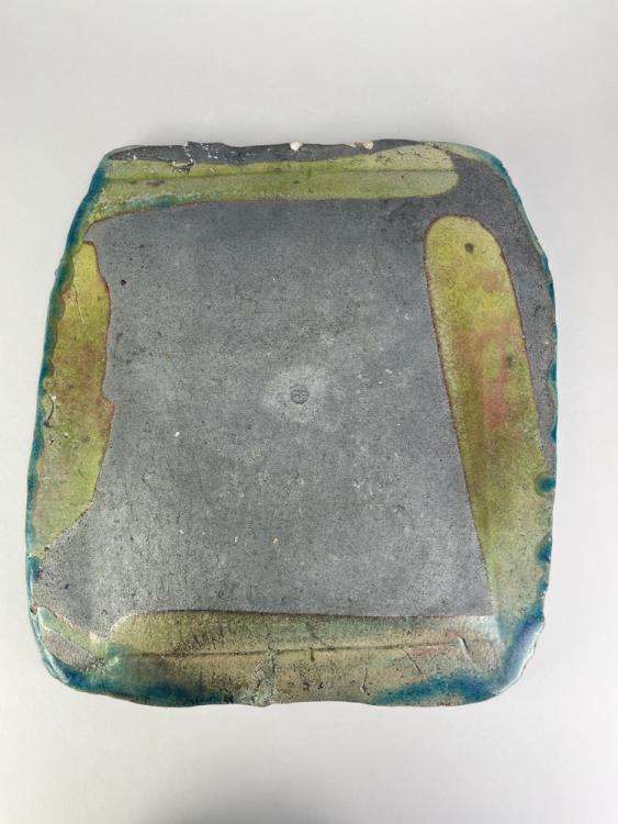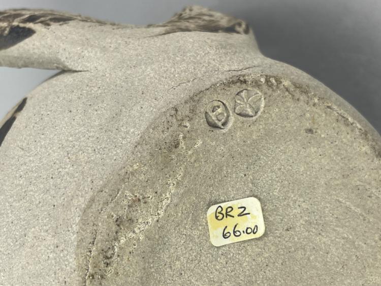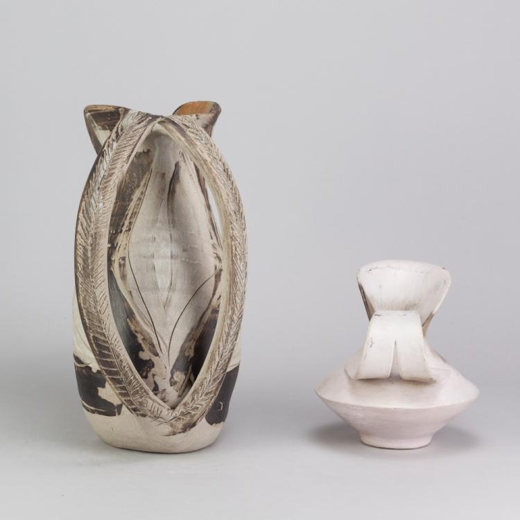 Lot 67 of 681: BIDDY ROSE; a stoneware sculptural twin handled jug, impressed marks, height 26cm, a further twin handled smoke fired jug by another hand, incised HR, and a large rectangular raku dish, impressed SH, 37 x 35cm (3). (D)