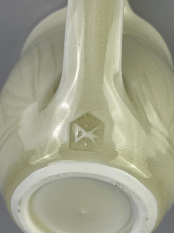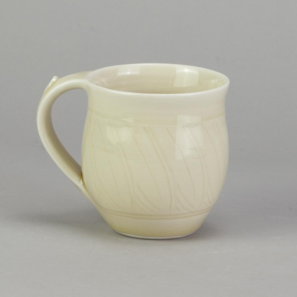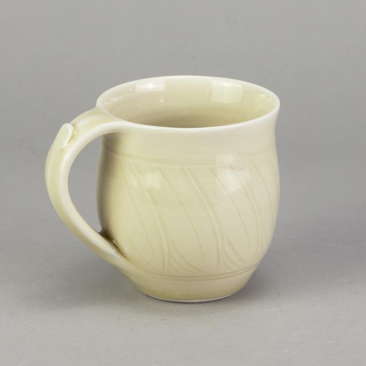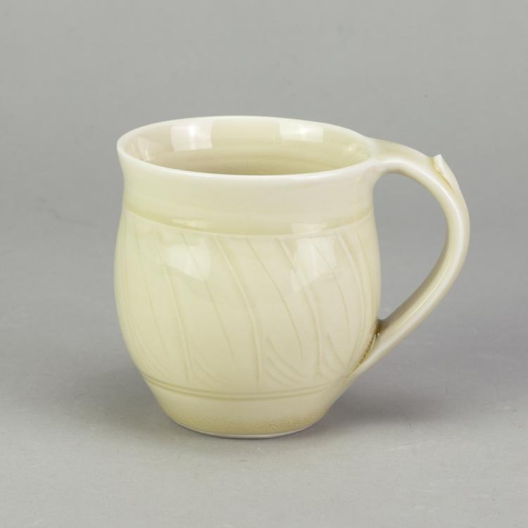 Lot 136 of 681: DEREK EMMS (1929-2004); a porcelain mug covered in pale yellow celadon glaze with incised decoration, impressed DE mark, height 9cm. (D)