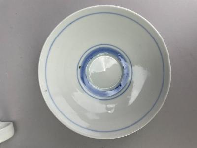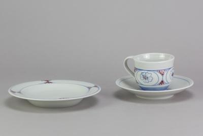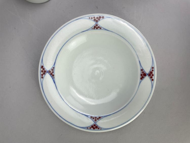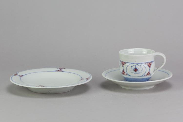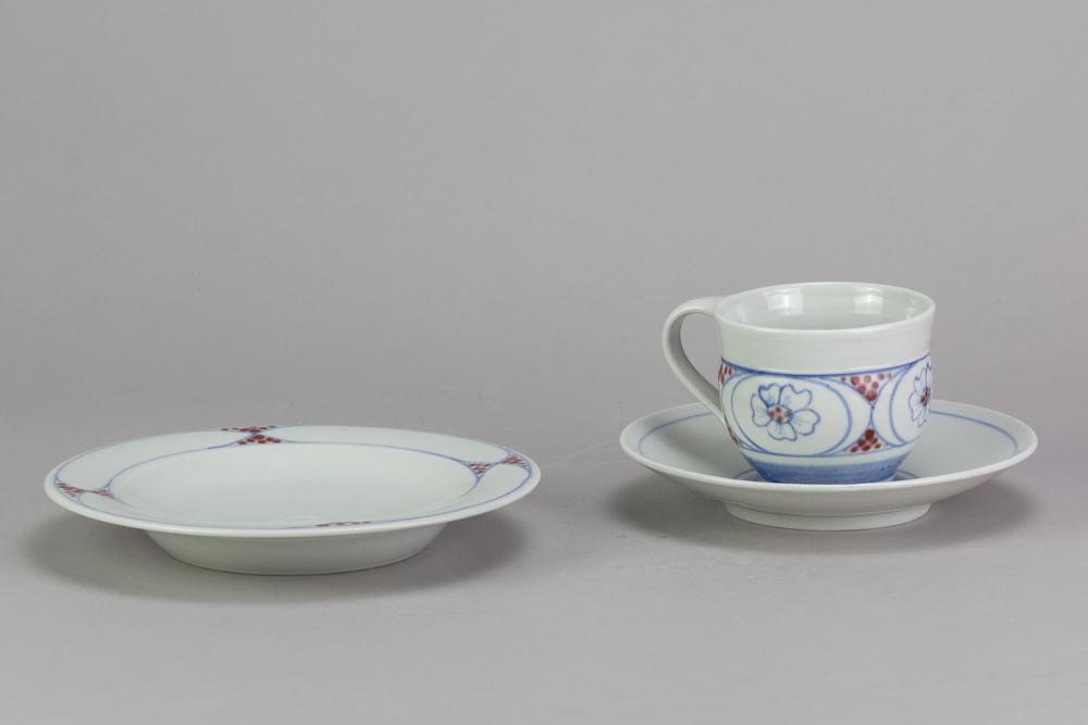 Lot 138 of 681: DEREK EMMS (1929-2004); a porcelain trio comprising cup, saucer and plate covered in celadon glaze with cobalt and copper red decoration, impressed DE marks, plate diameter 18cm (3). (D)