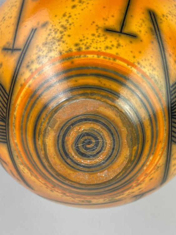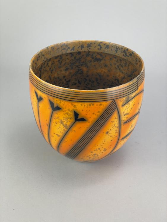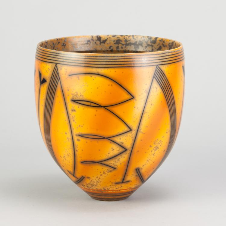 Lot 146 of 681: DUNCAN ROSS (born 1943); a smoke fired cup shaped vessel covered in burnished terra sigillata slip with inlaid geometric decoration, incised DR mark, height 17cm. (D) Provenance: Purchased from Oxford Ceramics Gallery, 2011.