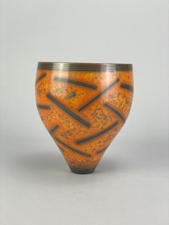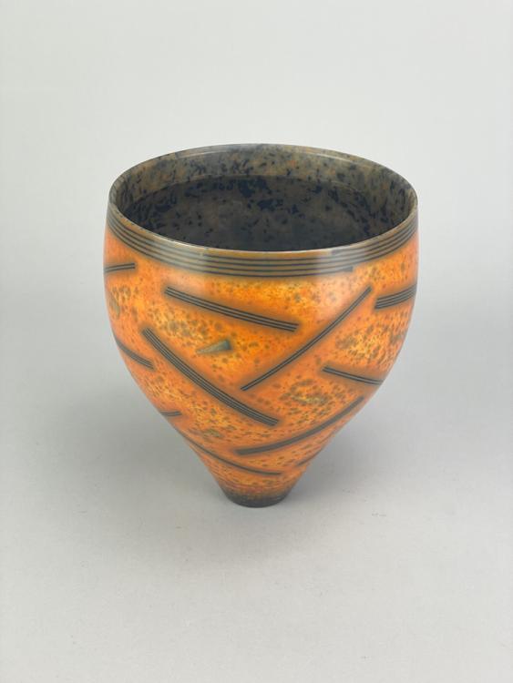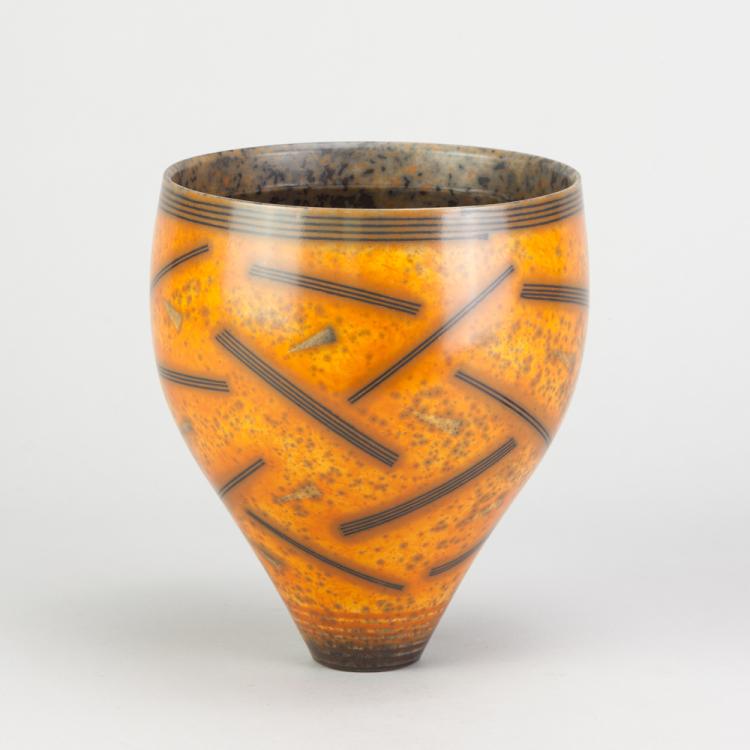 Lot 147 of 681: DUNCAN ROSS (born 1943); a smoke fired vessel with tapered base covered in burnished terra sigillata slip with inlaid geometric decoration, incised DR mark, height 18cm. (D) Provenance: Purchased from Craft Centre and Design Gallery, Leeds, 2007.