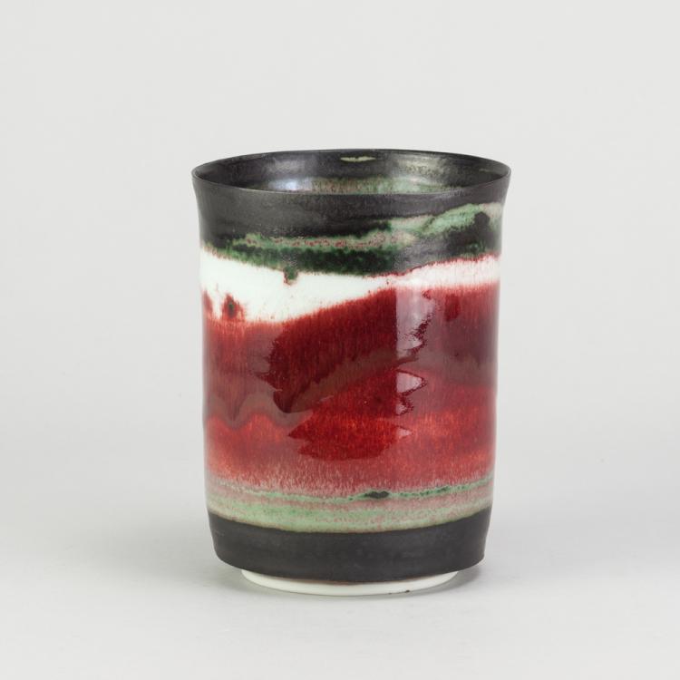 Lot 152 of 681: EDDIE CURTIS (born 1953); a porcelain cylindrical vessel partially covered in copper red glaze with manganese and copper green rim and base, impressed EC mark, height 15cm. (D) Provenance: Purchased from Lund Gallery, Easingwold, 2012.