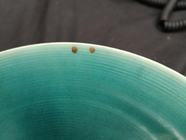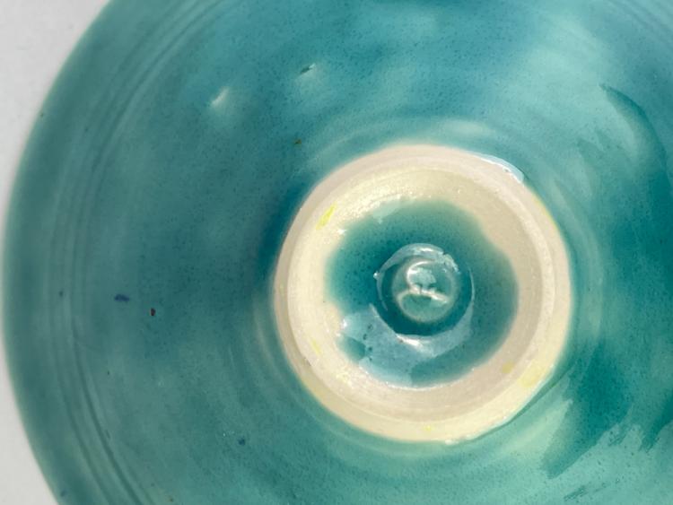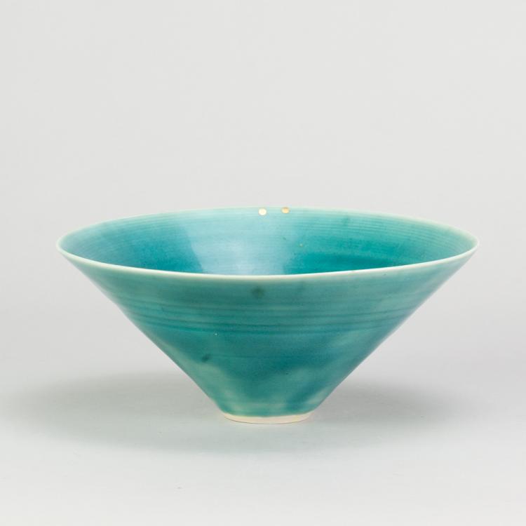 Lot 159 of 681: EMMANUEL COOPER (1938-2012); a porcelain conical bowl covered in turquoise glaze with gold and copper red highlights, impressed E mark, diameter 18cm. (D) Provenance: Purchased from Middlesbrough Institute of Modern Art, 2009.