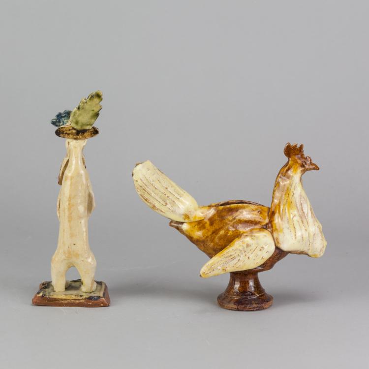 Lot 169 of 681: GEOFFREY FULLER (1936-2022); an earthenware bearded figure decorated with coloured slips, height 20cm, and a cockerel, length 18cm (2). (D)