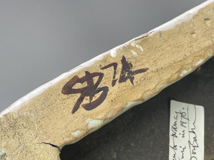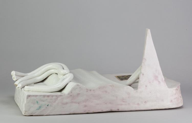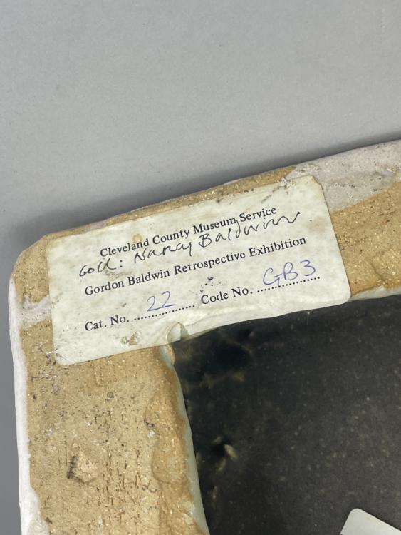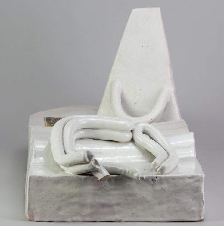 Lot 175 of 681: GORDON BALDWIN (born 1932); an earthenware sculptural form covered in white glaze with pinkish hues, a coloured square and line decoration, painted GB mark dated 1974, gallery label, height 26cm, length 55.5cm. (D) Exhibited: 'Gordon Baldwin: A Retrospective View', Cleveland County Museums Service, 1983. Provenance: Nancy Baldwin collection.