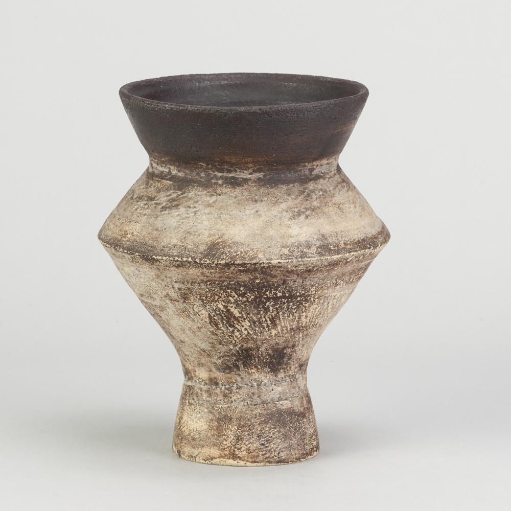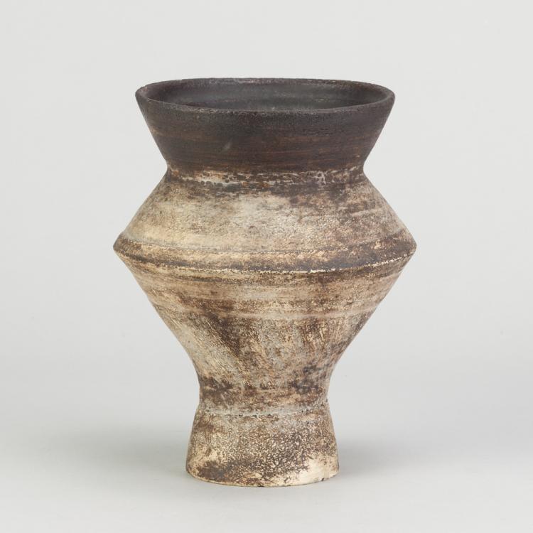 Lot 184 of 681: HANS COPER (1920-1981); a stoneware angular vessel covered in white slip over textured manganese ground with manganese flared collar and interior, impressed HC mark, made circa 1958, height 18cm. (D) Exhibited: Primavera, London, 1958. This was Coper's first one-man show in London, for which this form was developed.  Literature: Tony Birks, 'Hans Coper' (Collins, 1983), p. 99 for further examples of these forms.   Provenance: Purchased from Oxford Ceramics Gallery, 2008.