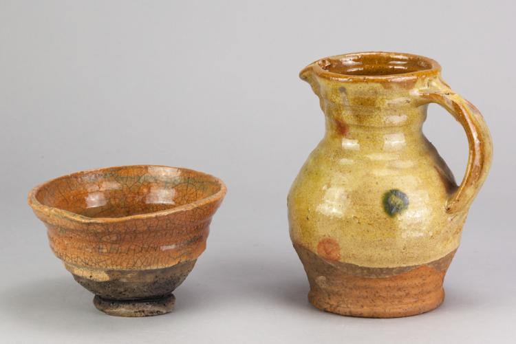 Lot 205 of 681: ISABELLE PAMMACHIUS for Boisbelle; a slipware jug, incised IP and pottery marks, height 18.5cm, and a raku bowl covered in dark pink crackle glaze by another hand, diameter 15cm (2). (D)