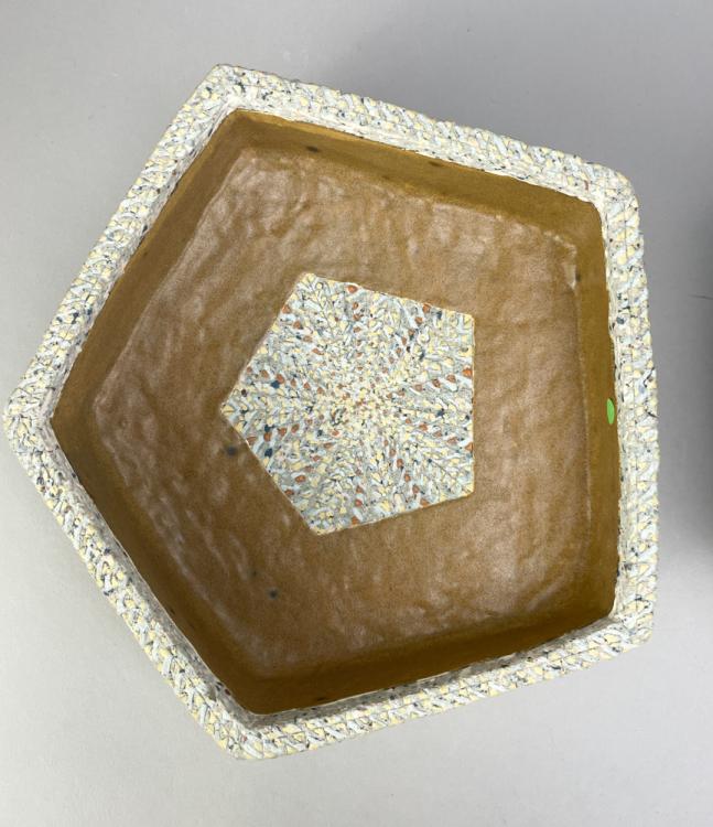 Lot 356 of 681: KISHI EIKO (born 1948); 'Pentagon', a stoneware box and cover decorated with inlaid small applications of various pastel coloured clays to form an intricate mosaic-like pattern of radiating lines, height 15.5cm, maximum diameter 20cm, with signed wooden box.