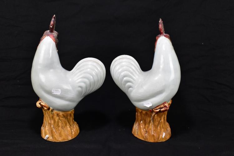 Lot 3 of 2095: A pair of 18th/19th century part celadon glazed and painted large models of cockerels, height 39cm and 38cm.