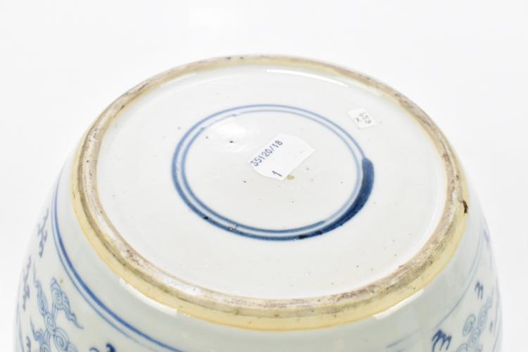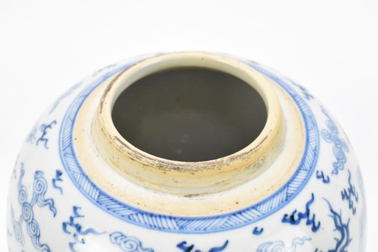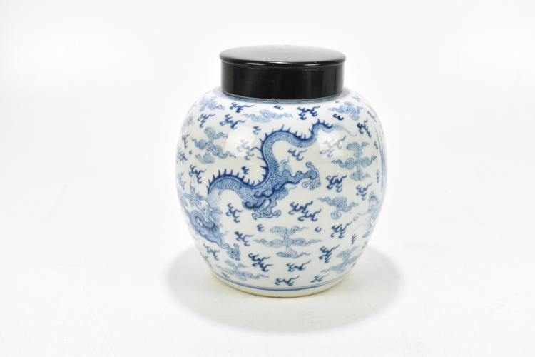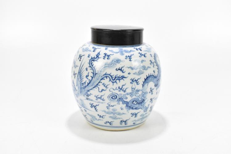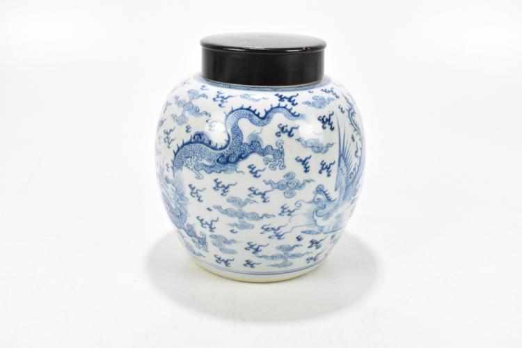 Lot 5 of 2095: A 19th century Chinese blue and white porcelain ginger jar with associated wooden cover, decorated with four claw dragon chasing flaming pearl and with peacock, Kangxi double ring mark to base, height 23cm.