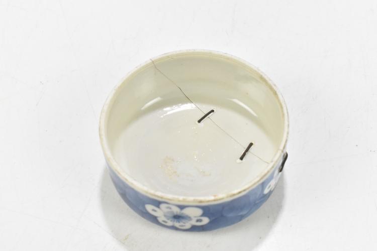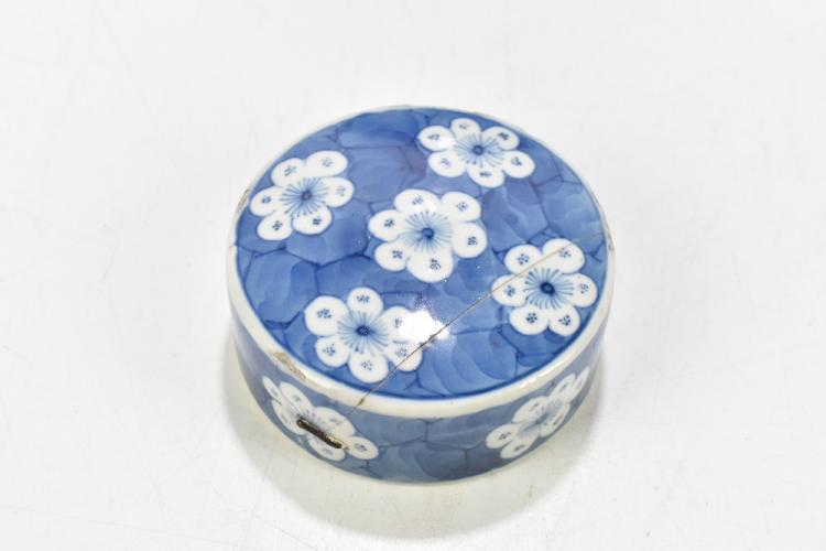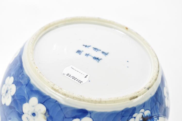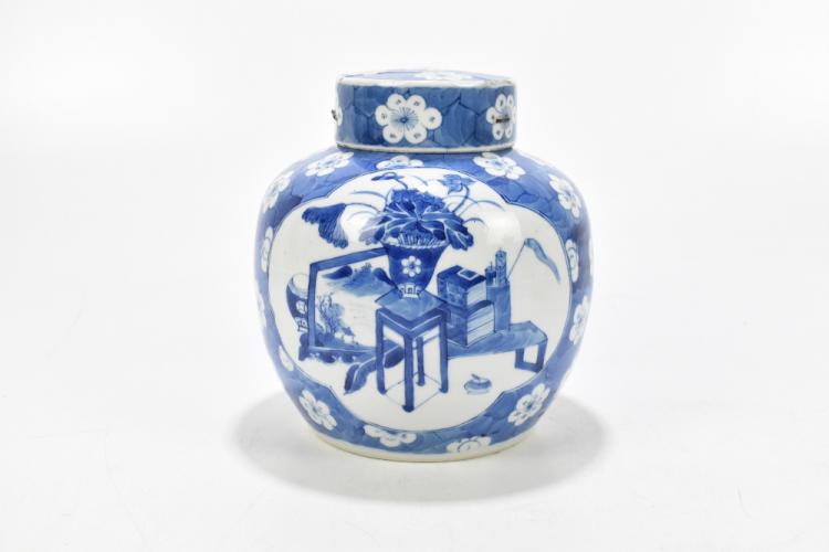 Lot 6 of 2095: A 19th century Chinese blue and white porcelain ginger jar and cover decorated with two quatroform shaped panels with objects inside a border of prunus flower, bearing six character to the underside, height 21cm.