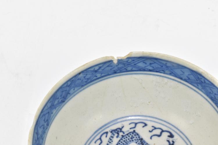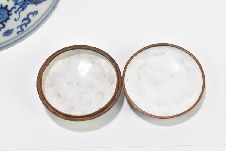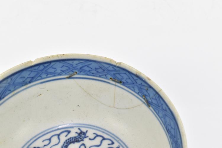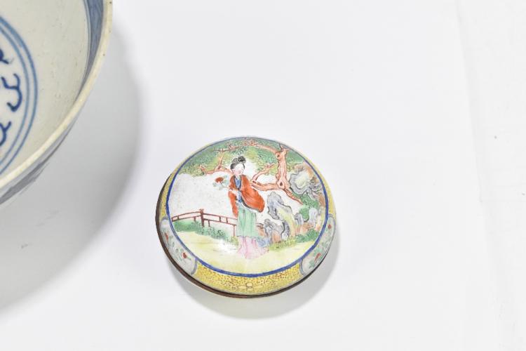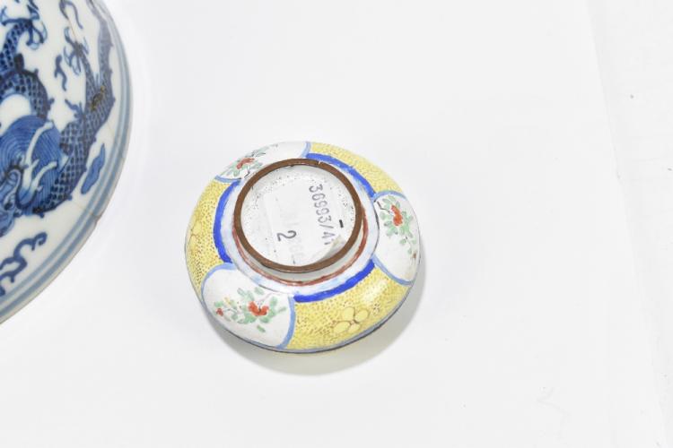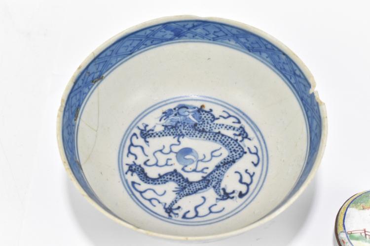 Lot 24 of 2095: A 19th century Chinese blue and white porcelain footed bowl painted with four claw dragons chasing the pearl of wisdom, bears four character mark to the underside, diameter 15cm (af), and a Chinese enamelled trinket dish and cover (2).