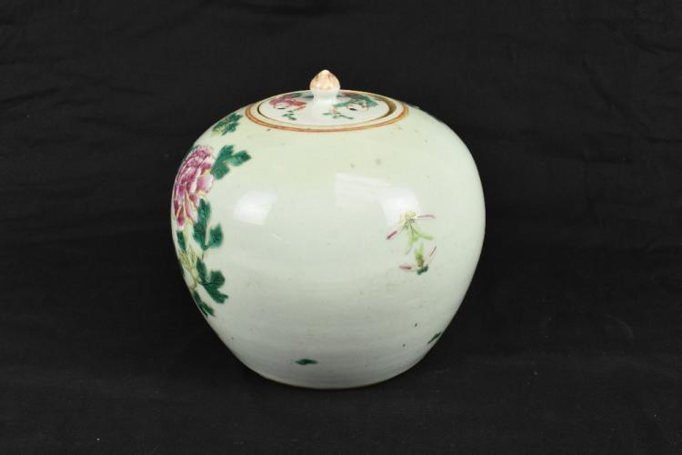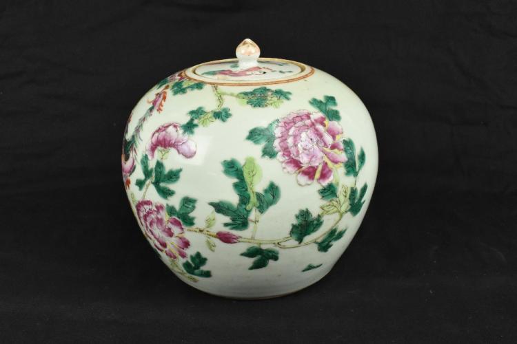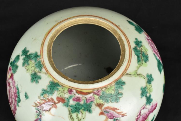 Lot 34 of 2095: A late 19th century Chinese Famille Rose jar and cover of bulbous form decorated in enamels with peacock and floral detail with associated cover decorated with boys, height 21cm, remains of wax seal to underside.