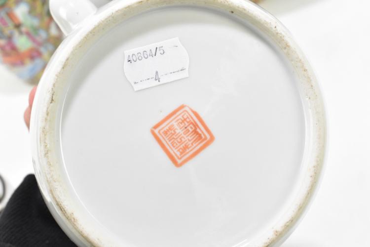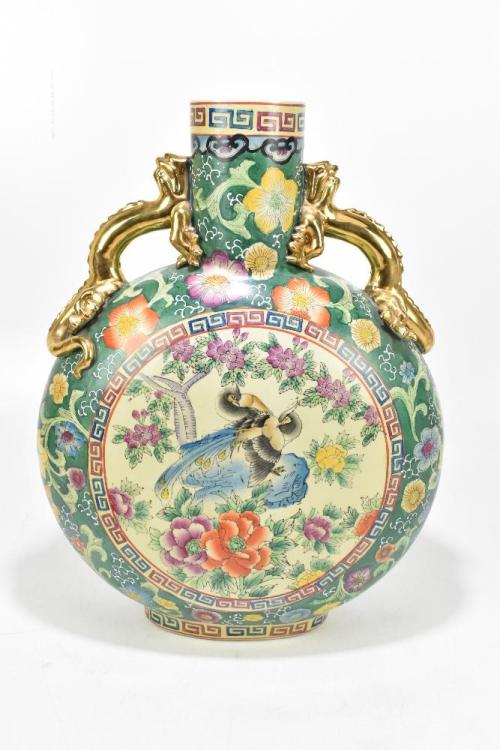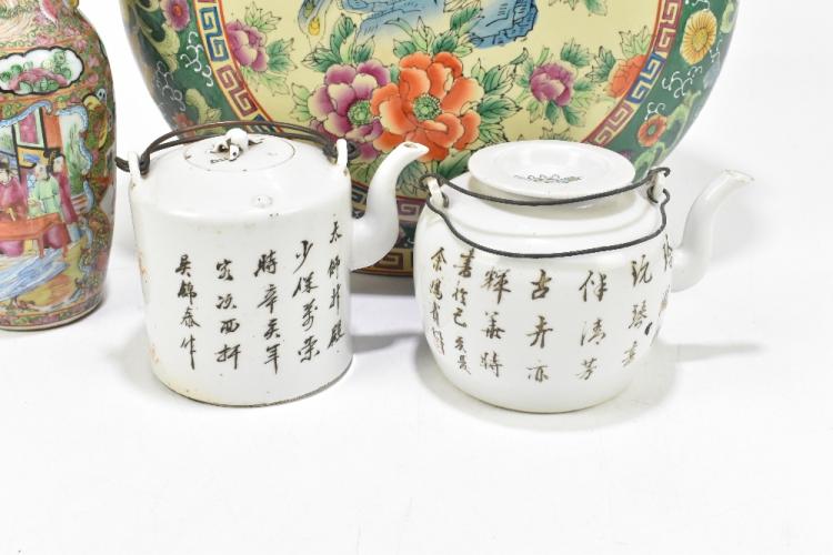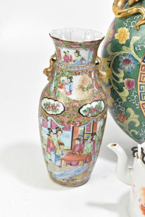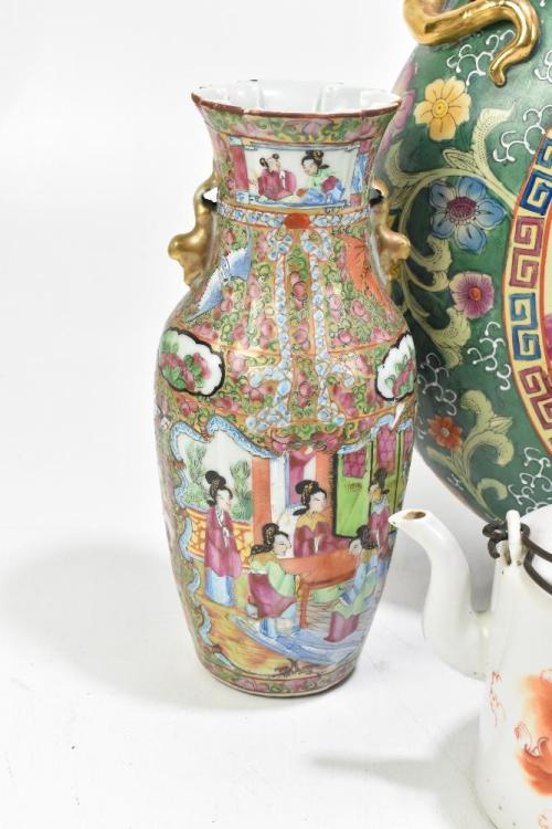 Lot 36 of 2095: A 19th century Chinese Canton Famille Rose vase with moulded neck and handles, height 27cm, together with two Chinese porcelain teapots including an example decorated in the Famille Verte palate, decorated with objects, height 12.5cm, and modern Chinese moon flask, height 50.5cm (4).