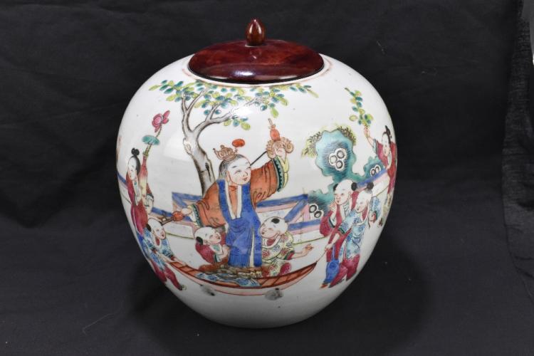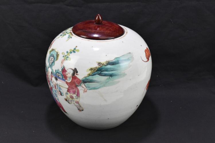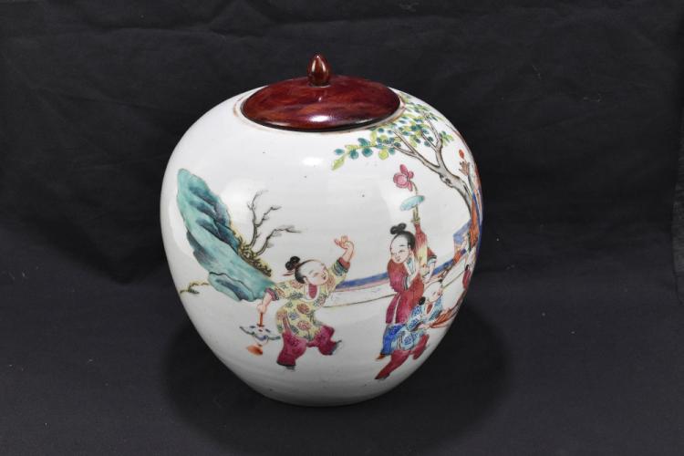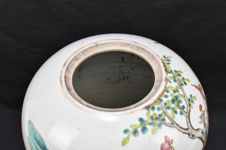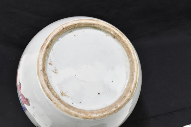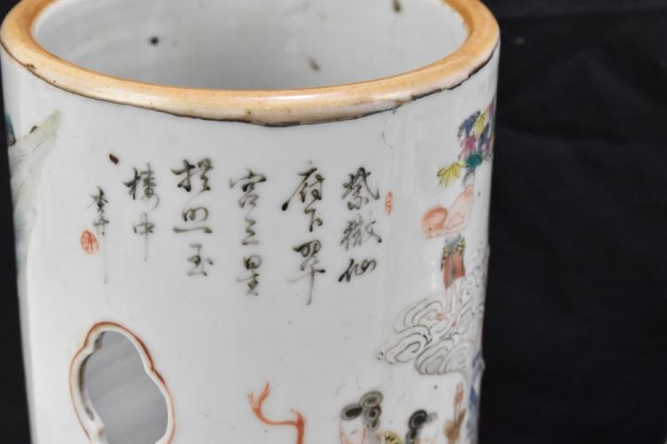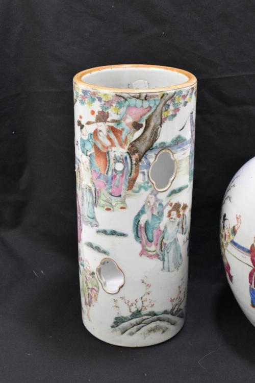 Lot 37 of 2095: A late 19th century Chinese Famille Verte brush pot, painted with Sanxing (deities) inside quatroform pierced detail and text, height 28cm, together with a late 19th century Chinese Famille Rose jar with associated cover and a modern Japanese bowl (3).