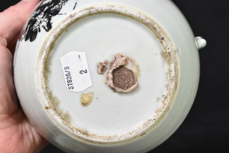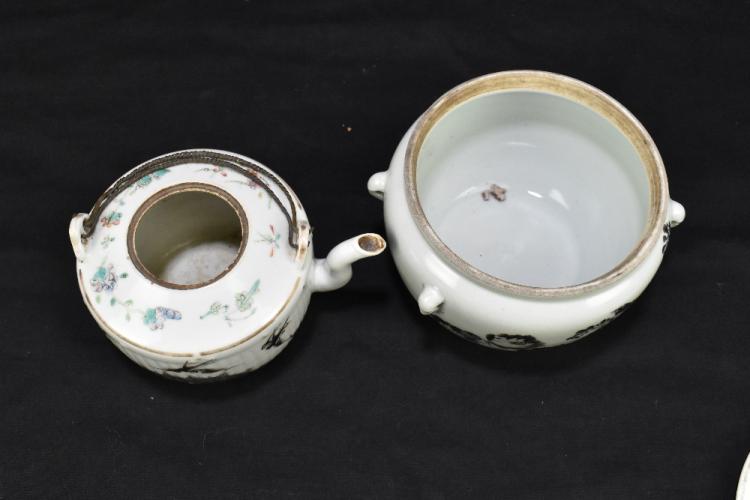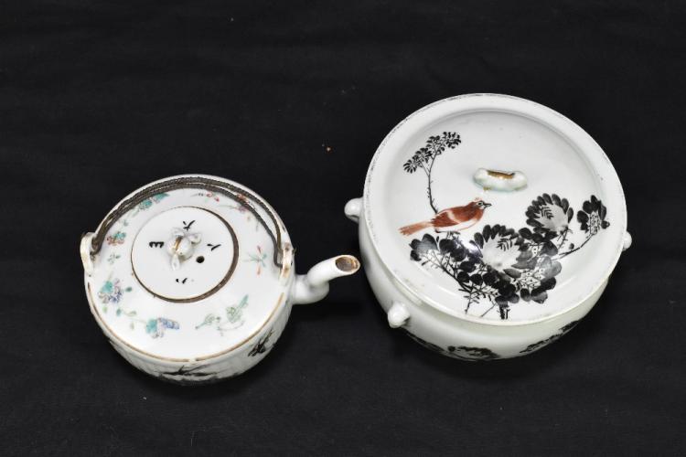 Lot 38 of 2095: An early 20th century Chinese Famille Rose porcelain teapot with ribbed body decorated with mythical birds, height 10cm, and a late 19th/early 20th century Chinese porcelain lidded bowl of circular form, painted with an exotic bird and nesting scene, bears wax seal mark to underside, diameter 13cm (2).