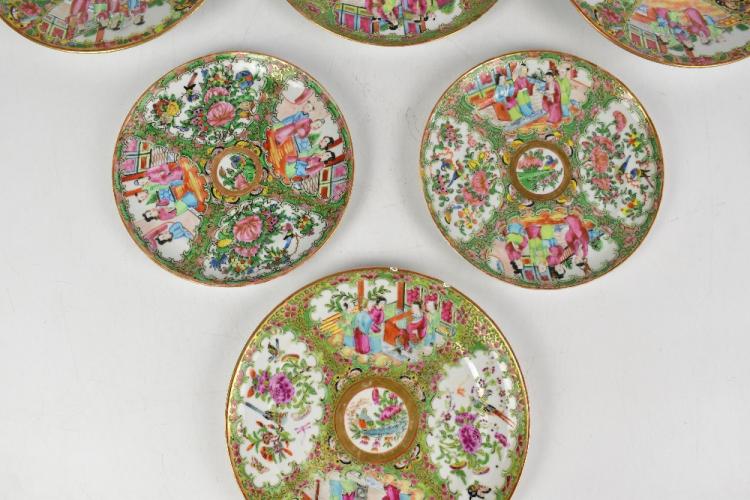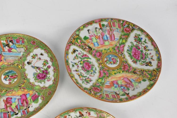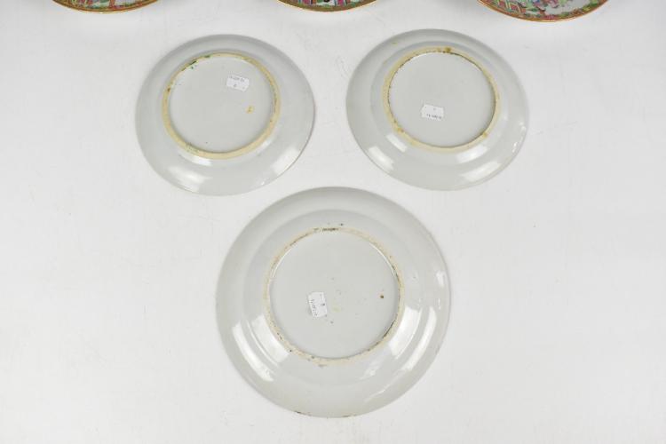 Lot 40 of 2095: A pair of late 19th century Chinese Canton footed bowls decorated with figures and birds in panels, diameter 24cm, and four later dishes (6).